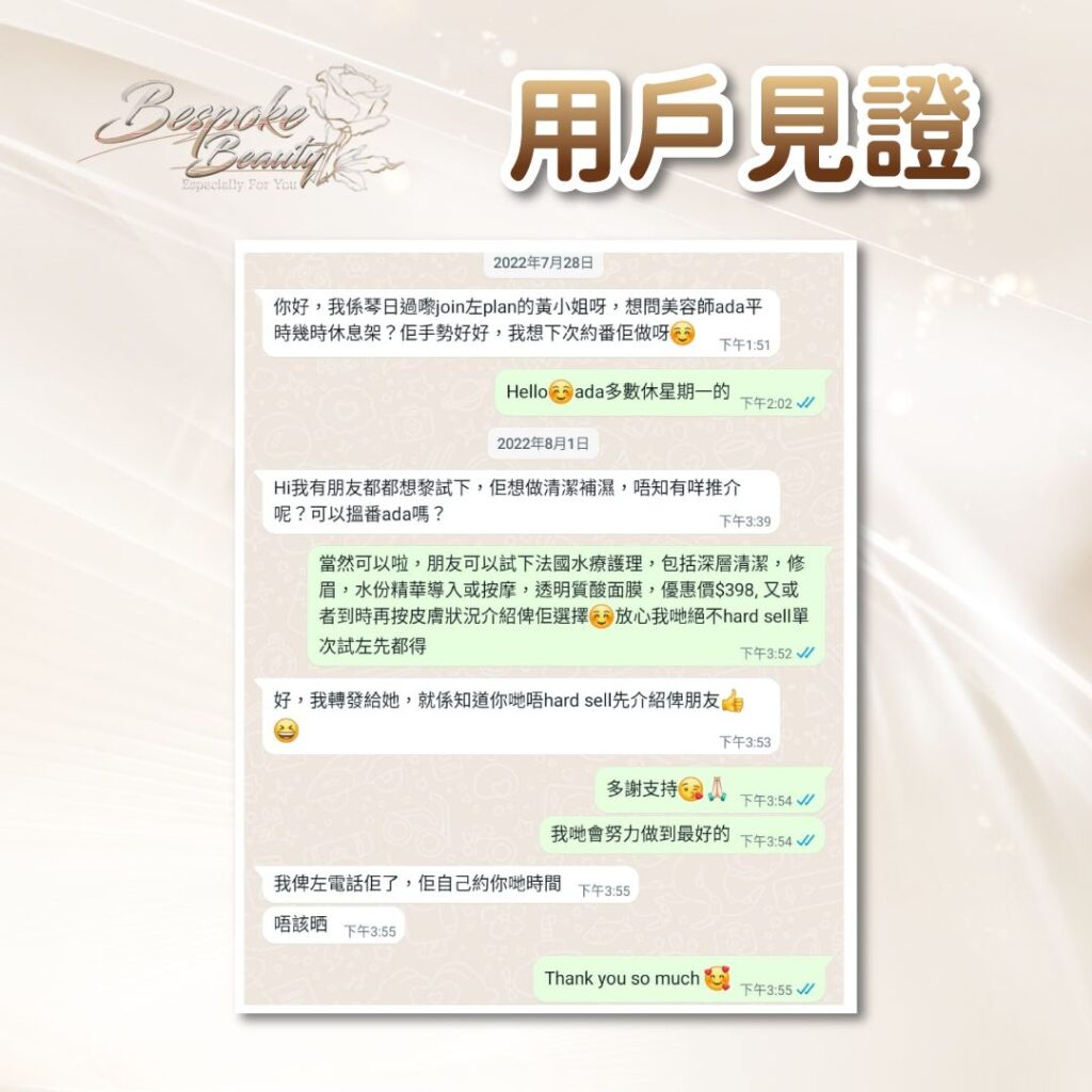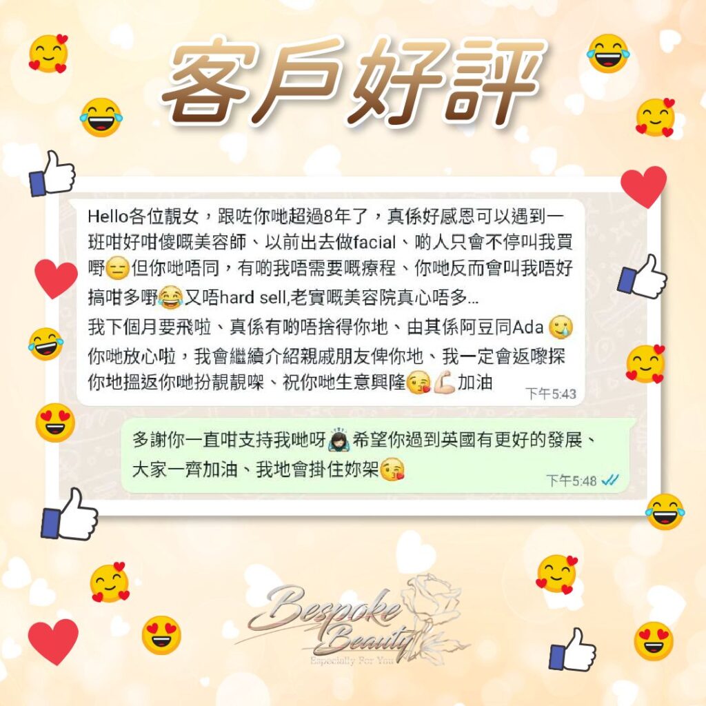 在Bespoke Beauty已經做咗8年美容了,每次來都感覺非常親切。美容師會根據皮膚實際情況安排療程,仲叫我做好必要嘅療程就OK,唔需要嘅療程就唔好搞咁多嘢,都未見過咁老實的美容院,有錢都唔亂咁賺,媽咪都大讚。不過我要去英國發展了,好捨不得陪伴咁多年嘅你哋,假期我都會番香港搵你哋幫我扮靚靚㗎!加油!